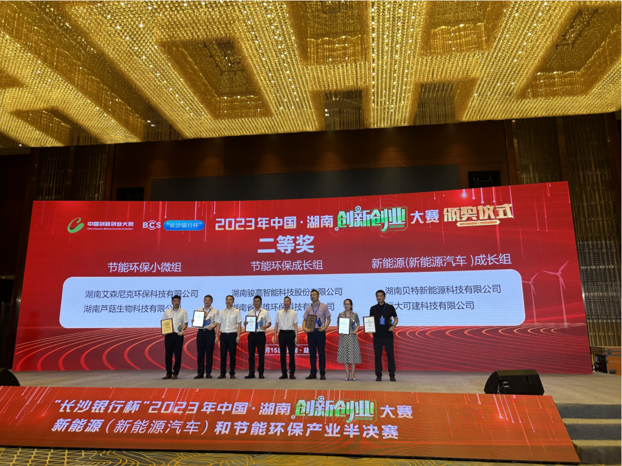 2023年8月15日,我司总经理姚理为博士参加了由湖南省科技厅、省发展改革委、省教育厅、省工业和信息化厅、省财政厅、省人力资源社会保障厅、省委网办、团省委、省工商联联合举办的第十届湖南省创新创业大赛的半决赛,大赛中88家优秀的科技创新企业展开路演比拼,争夺决赛名额,最终我司获得了“2023年中国·湖南省创新创业大赛新能源(新能源汽车)和节能环保产业”二等奖,顺利进入总决赛。